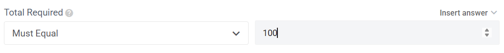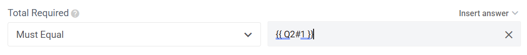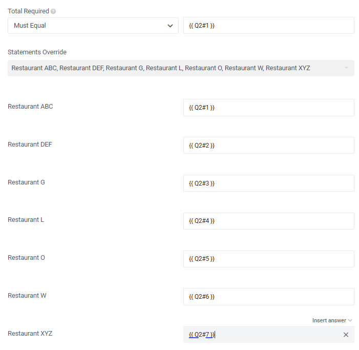 - Click the 'Insert answer' dropdown in each field and select a previous constant sum question. This will inject a dynamic variable that looks like this {{ QX#1 }} into your 'Statement Total' field.