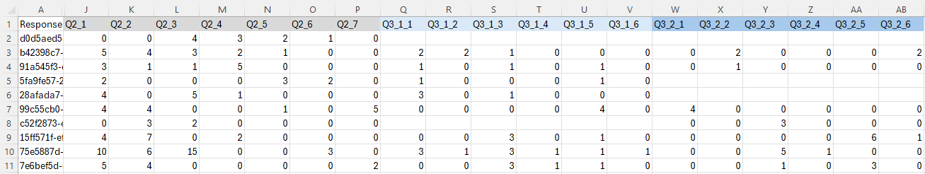 - 1 column per statement (if Matrix) and per choice. So at Q3 (blue), 7 statements x 6 choices = 42 columns.