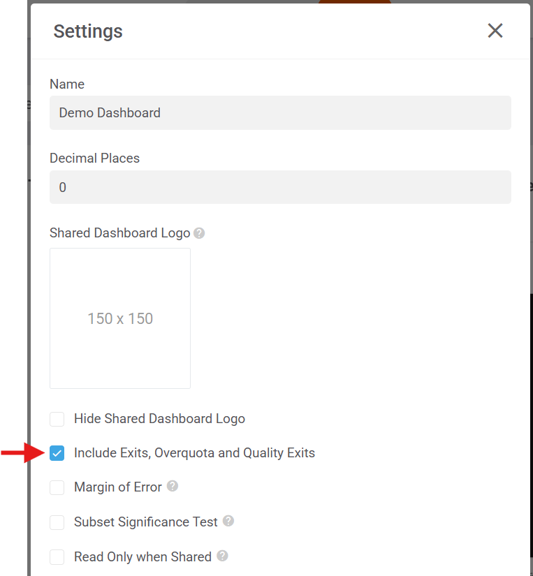 To include exits in your analysis, go to your dashboard settings, i.e. the cog icon at the top left in your dashboard bar, and tick "Include Exits, Overquota and Quality Exits".