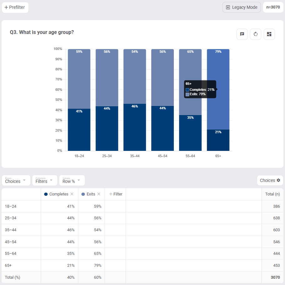 Exits are useful in analysis for Market Sizing studies, typically with Natrep on Entry, where you want to determine the incidence rate across different demographics like age, gender, location, etc., e.g. below, we can see over 40% of 18–54 years qualified for this particular study vs. 35% of 55–64 years and only 21% of 65+ years.