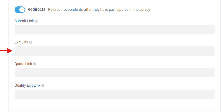 If you're using panel partners, either via 'Universal Link' or 'Panel Partners' channels, they'll have a specific redirect for exits, so make sure to add this in your channel's Advanced Options > Redirects > Exit Link field. You don't need to add redirect links if you're using Glow's 'Integrated Consumer Panel' channel as they're built in. Likewise, certain panels in the 'Panel Partners' channel will have no redirect fields available as they've been built in, so already added.